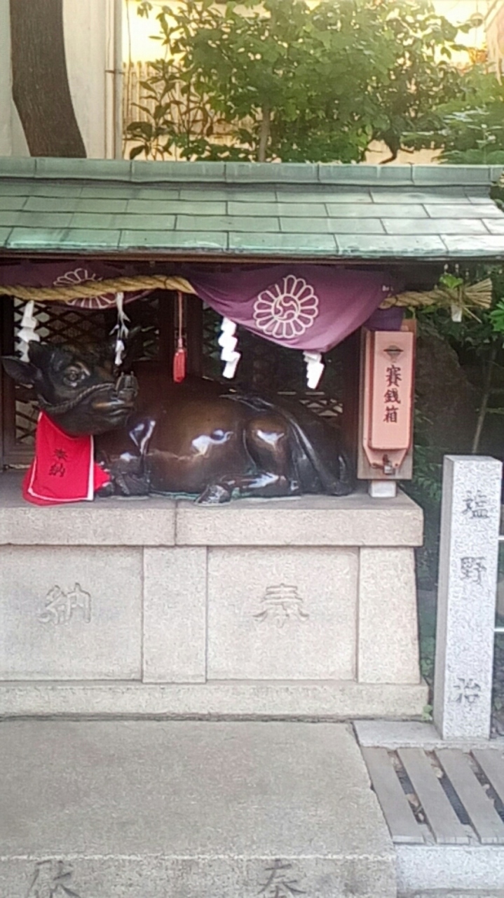 梅田から南東方向にある露天神社(俗にいうお初天神)の境内にあります。自分の身体のよくない部分とこちらの神牛の同じ部分を触れることによって浄化していただいて治癒の祈願をするそうです。近隣の高齢者の方が熱心に祈願されてました。