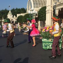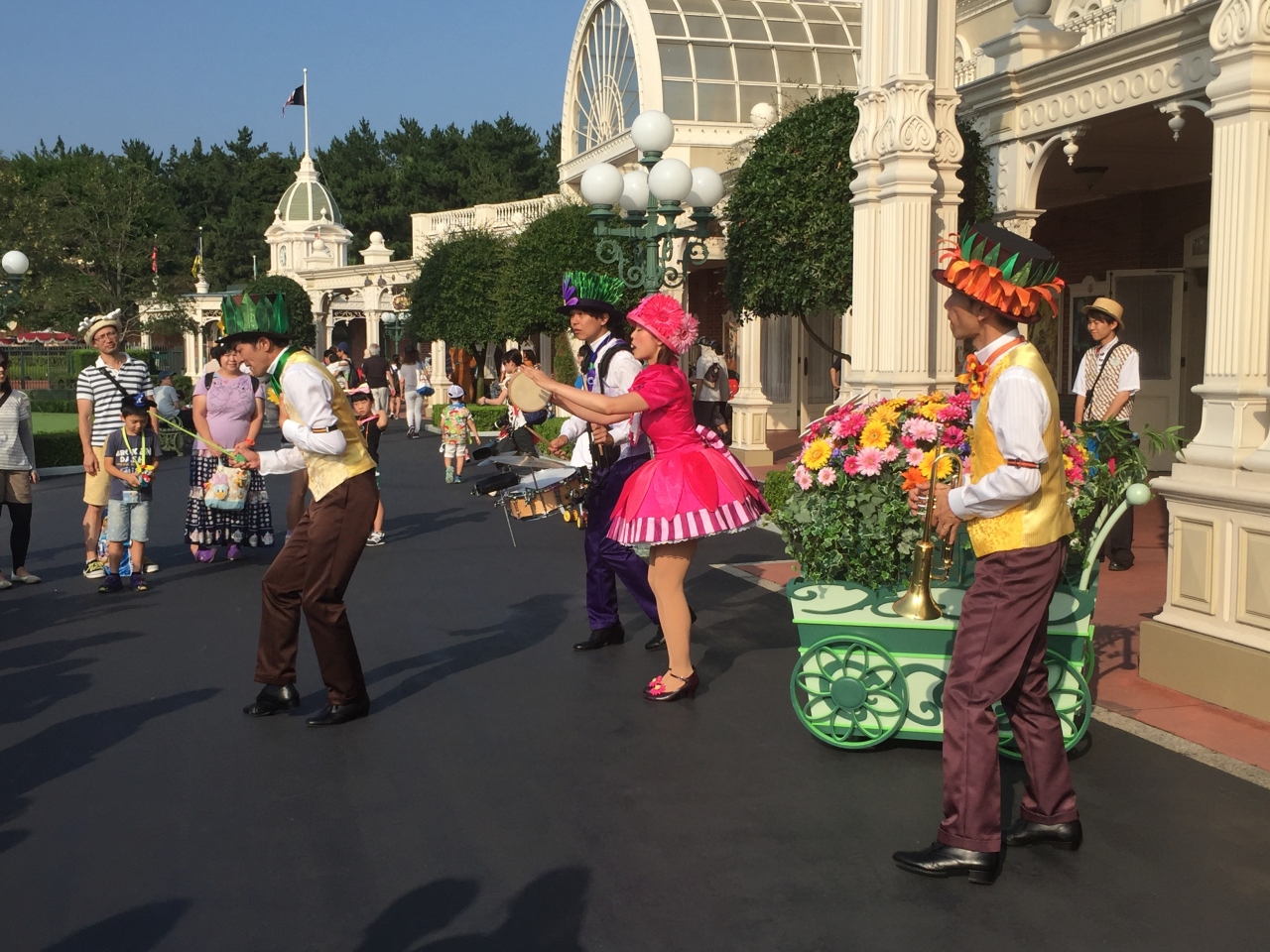 ウェルカムフラワーバンドはパークに咲いているお花を紹介するもので、どちらもワールドバザール手前で行われていました。