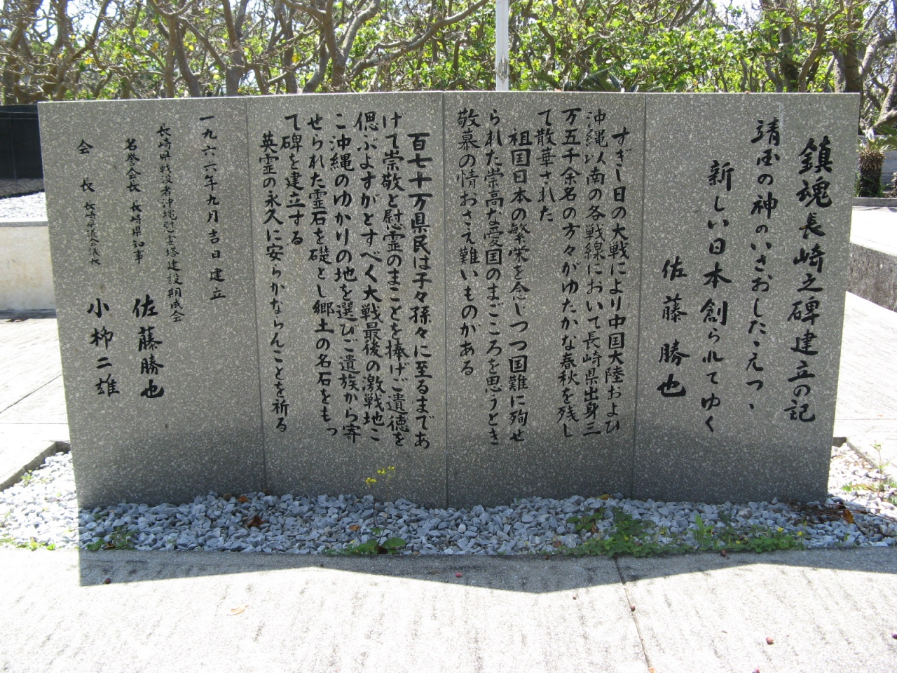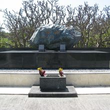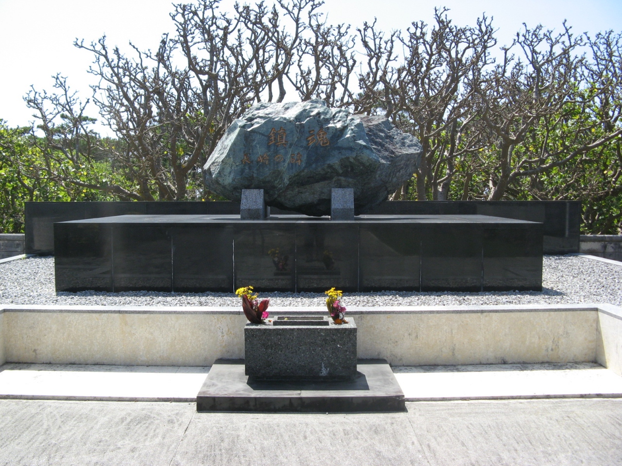 慰霊塔は、沖縄産の礎石のうえに長崎産の大きなの蛇紋石の碑石を置いたシンプルなもので、碑石をやや傾けて浮かせているのは、故郷への思慕の気持ちを表現しているとか。