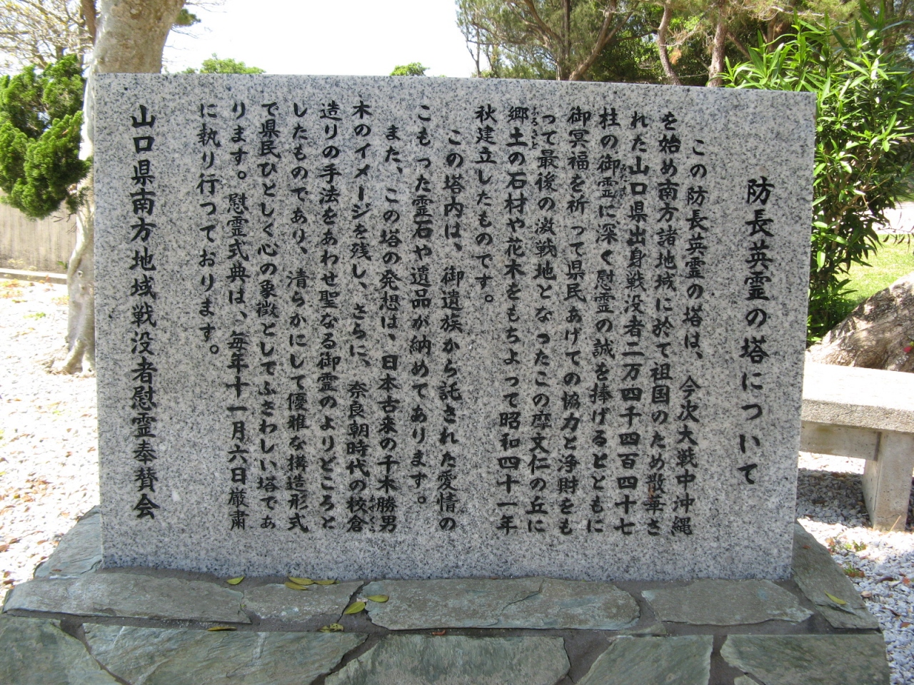 慰霊塔の名である、「防長」とは山口県の旧国名「周防」「長門」によるもので、塔は千木(ちぎ)と鰹木(かつおぎ)と校倉造りという日本古来の神社形式をイメージしたデザインになっています。