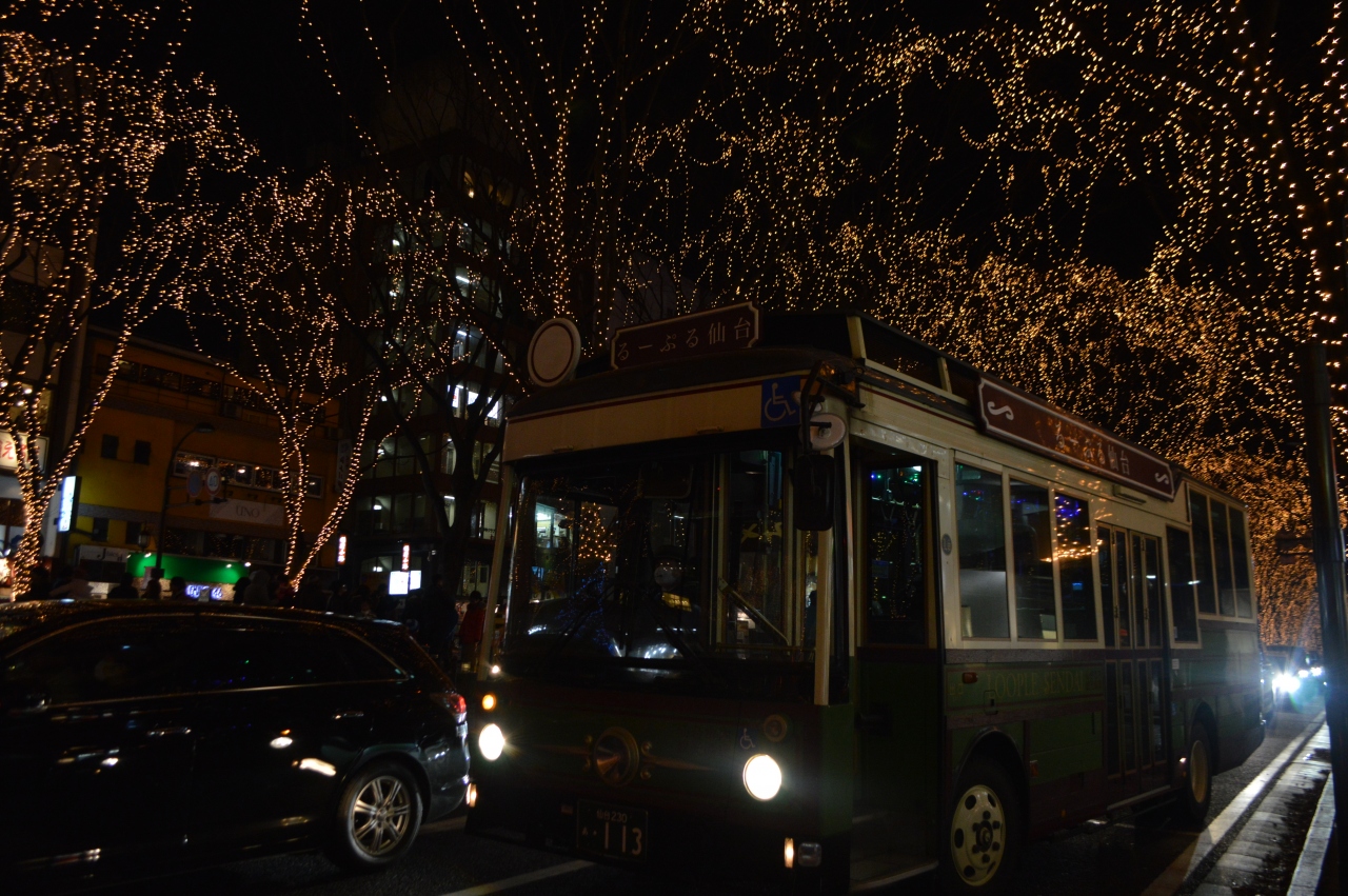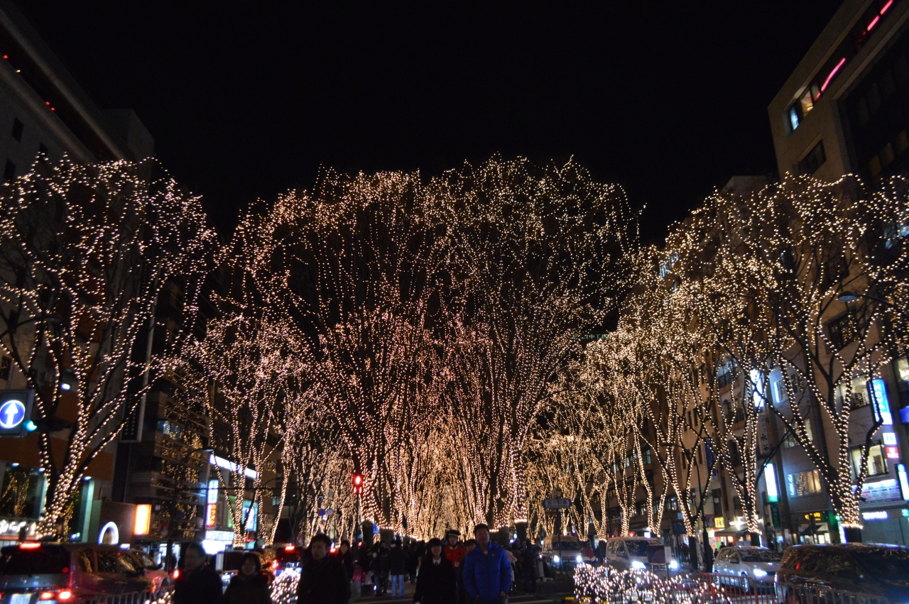 当地に出かけてたまたま知りました。12月限定のイベントです。戦後の復興を願ったのはが始まりで現在まで毎年続けられています。60万個のLED電球が使われていますが、電気の消費量は少なく巻き付けられるケヤキの木にも害はないようです。