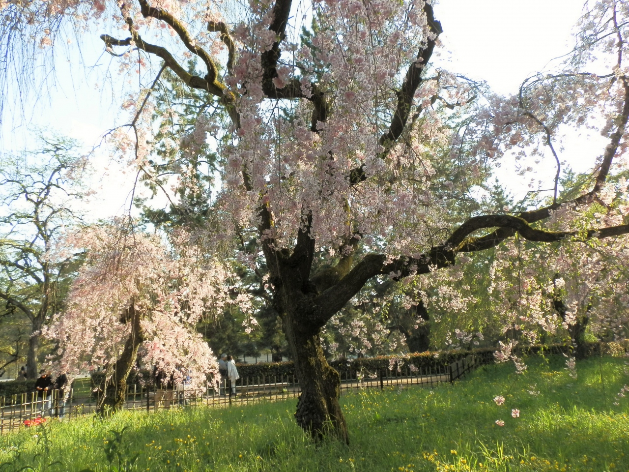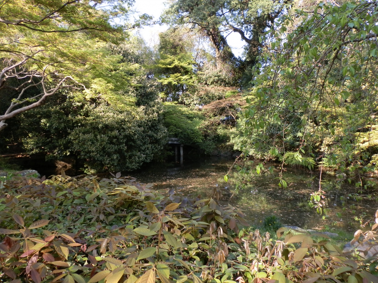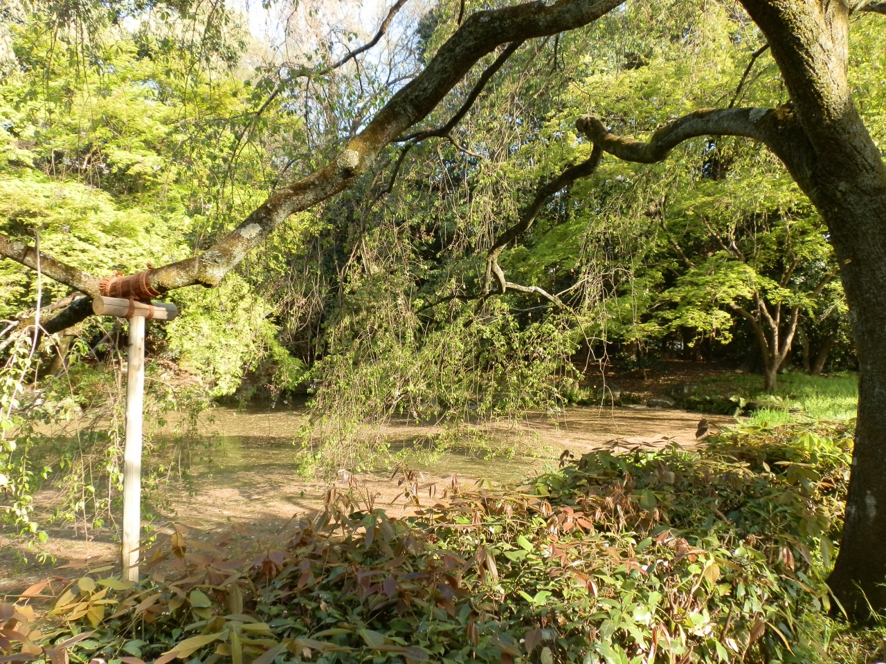 左手の鬱蒼とした林の中に、わずかに滝組が残っています。苑池にかかるしだれ桜、奥の中央部に石橋が見えます。その名残りから、池泉回遊式庭園が浮かんで来ます。大きな池を中心に配し、その周囲に園路を巡らして、築山、池中に設けた小島、橋、名石などで各地の景勝などを再現したに違いない。摂関家の格式が偲ばれます。