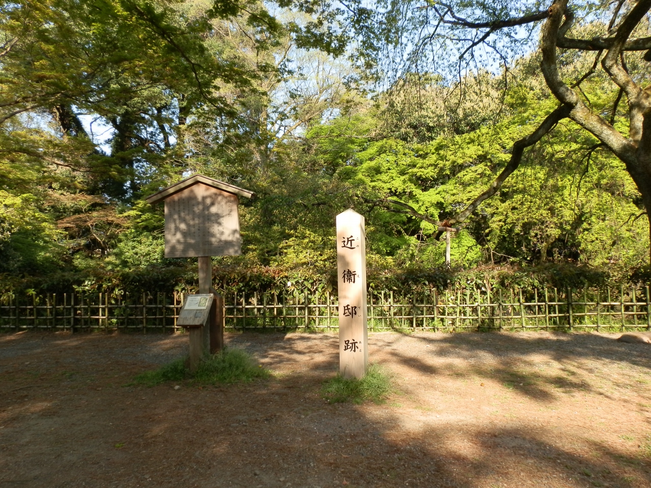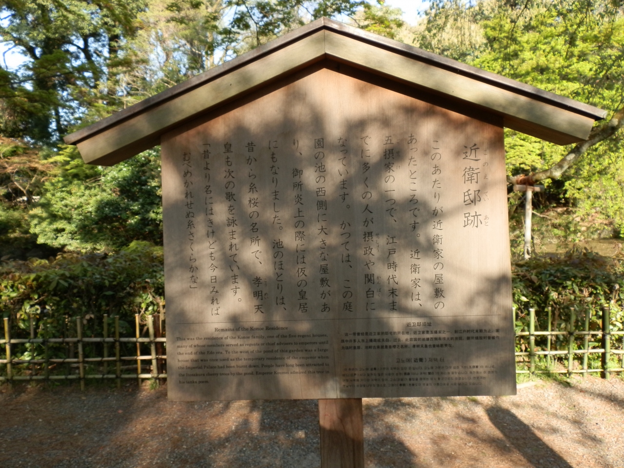 京都御苑の北側・今出川御門近くに五摂家筆頭であった近衛家の屋敷があった跡地があります。その跡地に「旧近衛邸跡」の木碑が立ち、その横には「近衛邸跡」木製の看板が立っています。その後部に近衛池があります。当時の庭園であった池のみが残り、日本有数のしだれ桜の名所となっています。