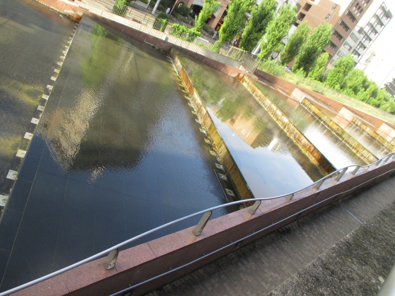 江坂駅の6番出口を出て下さい。かなり大きな公園です。憩いの場兼駅までの通り抜けルートという感じです。公園の出口あたりになかなか珍しい階段状の噴水があります。風がないときは、この水面に建物が映って綺麗ですよ。