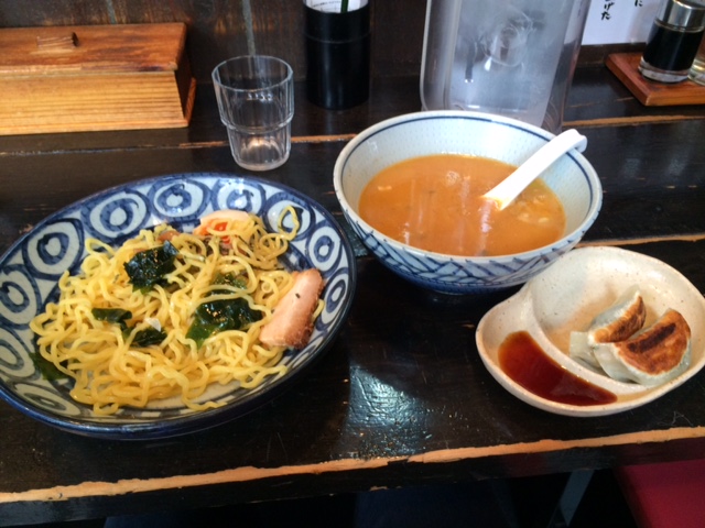 小田急相模原でラーメン屋を捜し入った店で、暑い日だったので、パンチがありそうな味噌味のつけ麺とシソ入り餃子を注文した。つけ麺は、少し麺と絡みにくい味で、ラーメン向きのタレだと思った。シソ入り餃子はさっぱりかつ食べごたえもあってバッチリだった。
