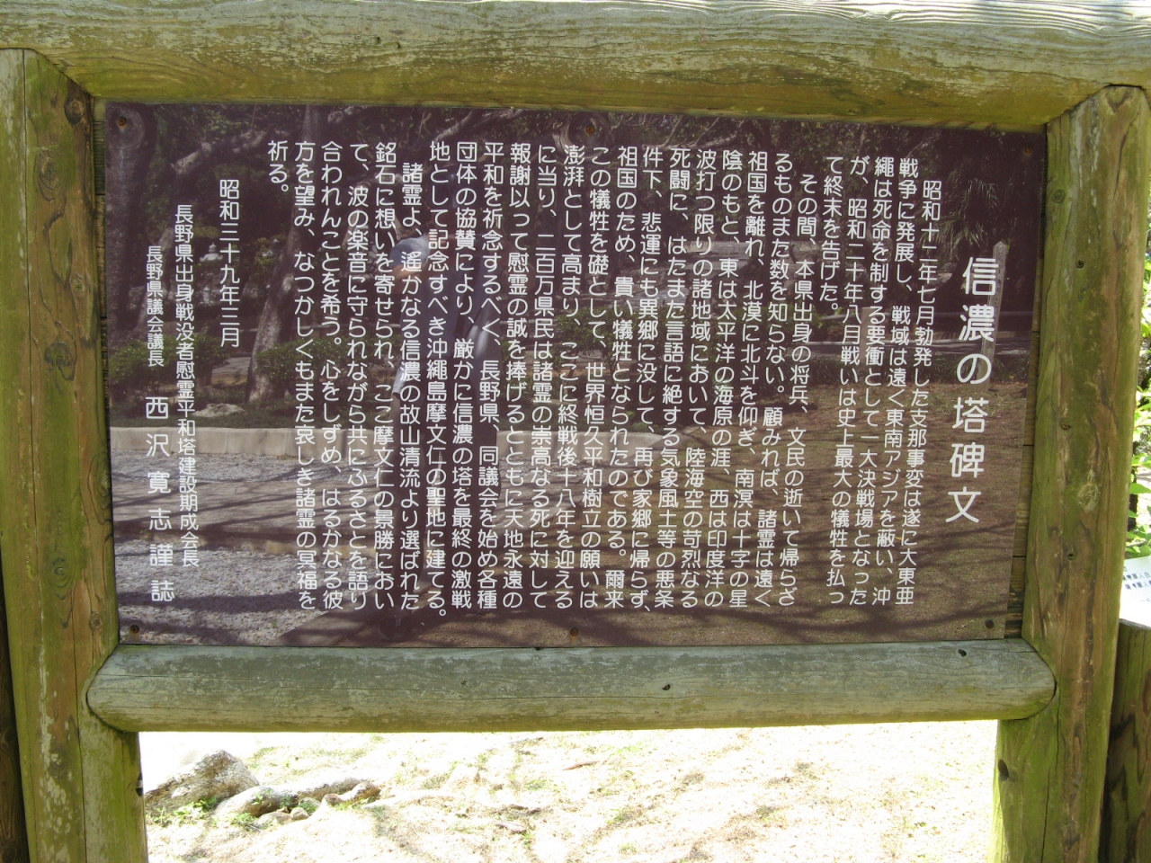 平和祈念公園にある都道府県の慰霊碑の多くは、沖縄および南方諸地域で戦没された英霊をお祀りされていますが、「信濃の塔」では、沖縄および南方諸地域だけでなく、中国や朝鮮、北太平洋諸地域を含むすべての地域で戦没された将兵、文民をお祀りされています。碑文を読むと、故郷を遠く離れ、過酷な環境のもとで戦われた県民に対する思いがストレートに伝わってきます。碑文の写真を添付しますので参照ください。