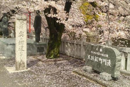 毎年4月初めの水門川は桜の花が満開です。昔がこの地まで船が遡ってきたとのことで歴史ある灯台がいあっも保存されていて一見の価値があります。またこの地は松尾芭蕉の奥の細道結びの地としても有名で記念碑もあります。
