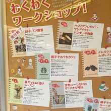 大人気な親子パン教室はすでに満員御礼!他にも時計つくりやサンドイッチ作りなどのワークショップをやってます。