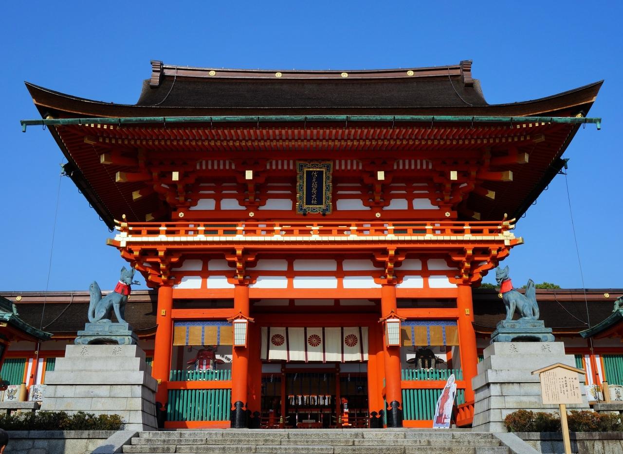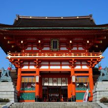 伏見稲荷大社の一番鳥居をくぐると、その先に朱の楼門が見えます。
