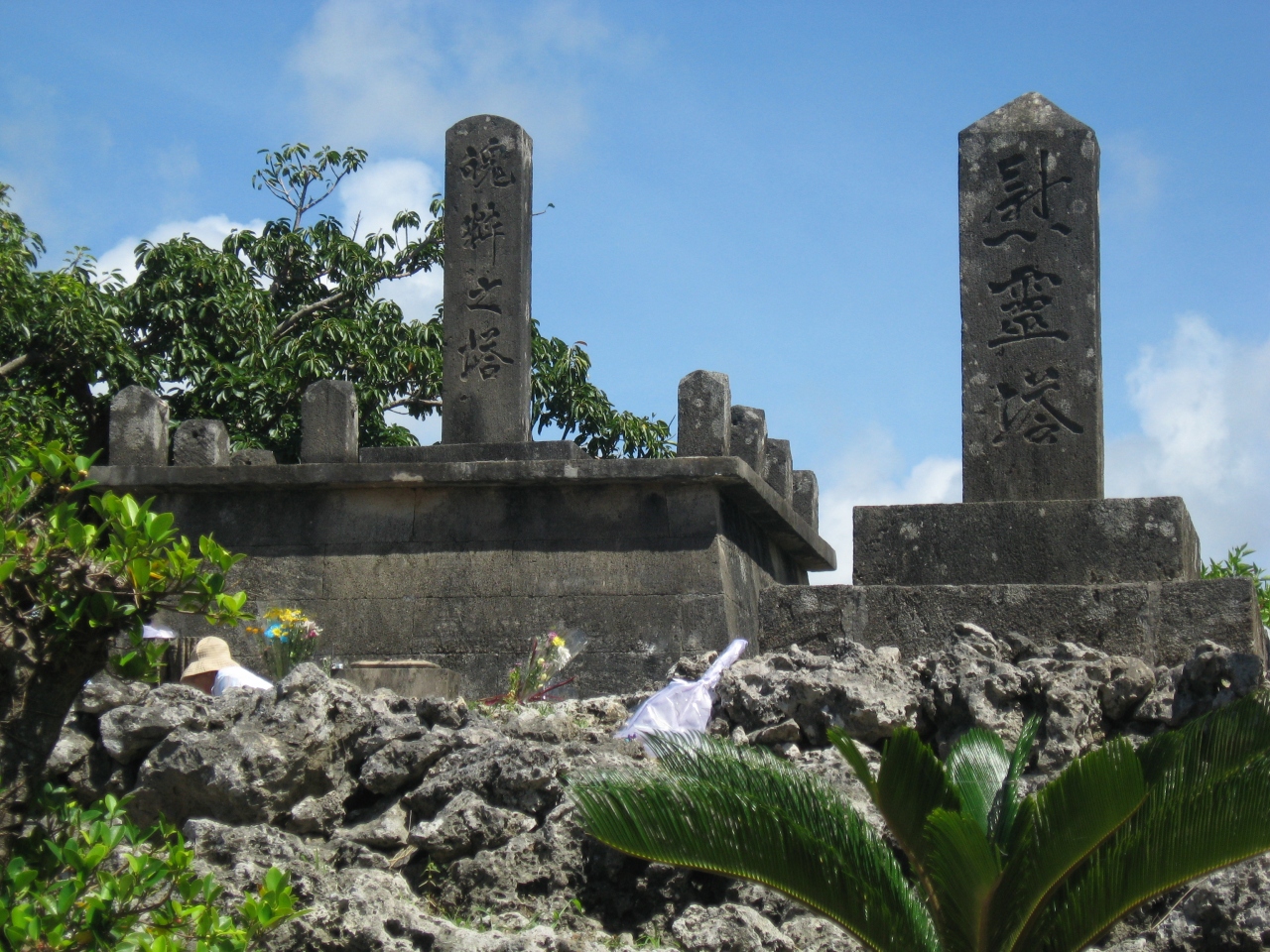 魄粋之塔にはお弁当を持って参拝に来られた年配のご夫婦がおられました。その姿はやはり沖縄戦に於いて多くの地元の方々が亡くなったことを表しているように思いました。建立目的の違うふたつの塔が並ぶこの場所は、戦中戦後の複雑な沖縄県事情を示しているのではないか…改めてそう思いました。