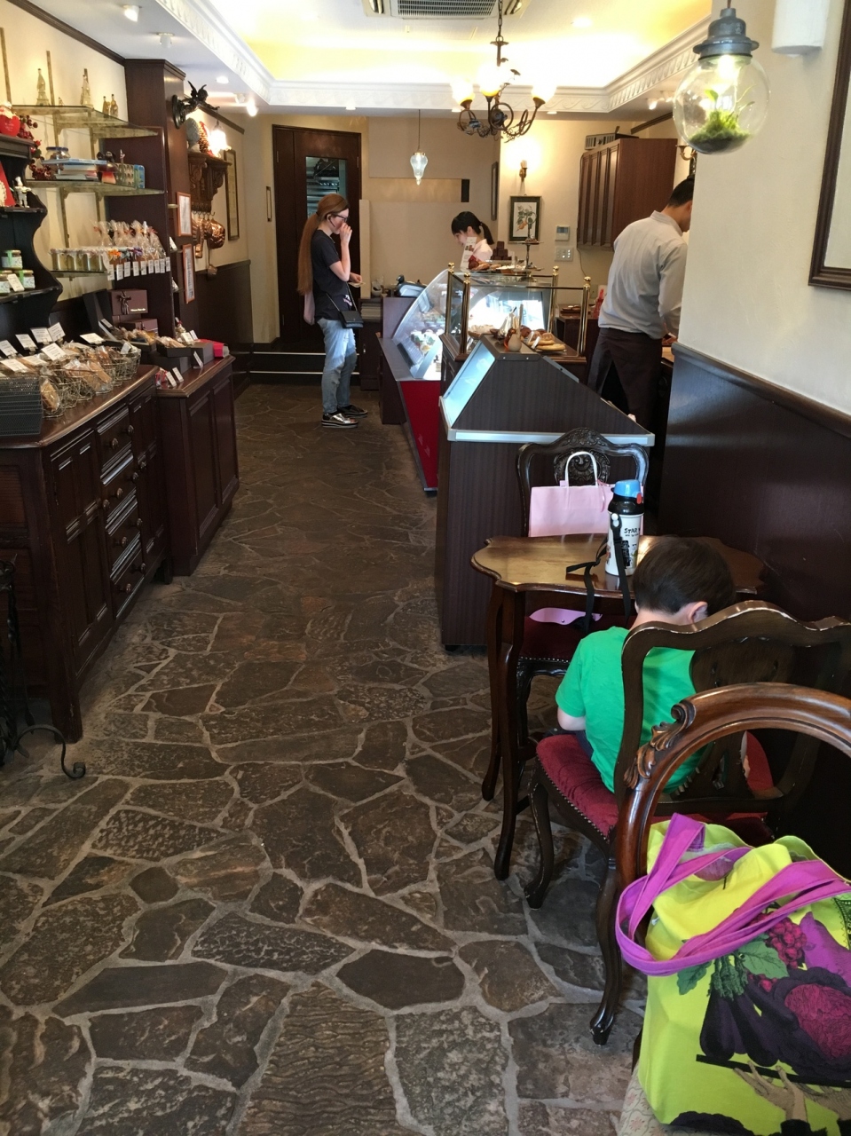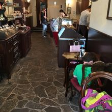 机が二つあり、イートインできます。飲み物はないのでお水と注文したケーキがお店でいただけます。
