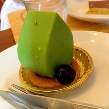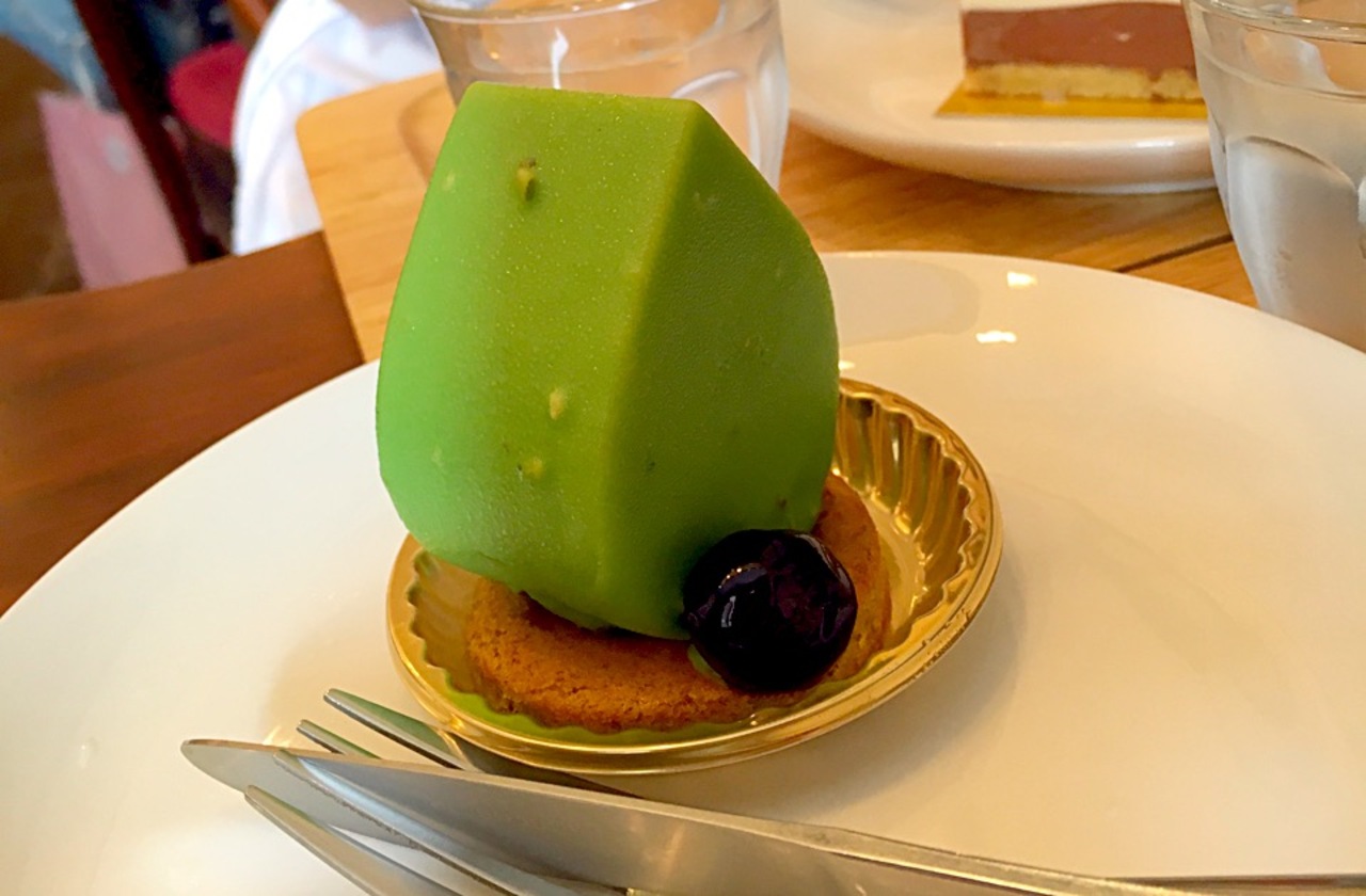さて、ケーキですが、まず見た目が可愛い(^ ^)!中はふわっと口どけいいピスタチオムース、中にチェリーのジュレ?が甘酸っぱくてムースと外のチョコと合う♪下の生地にもピスタチオが入ってるのかな。ほんのり味がして全体がまとまった味です。珈琲と食べたかったー。