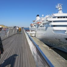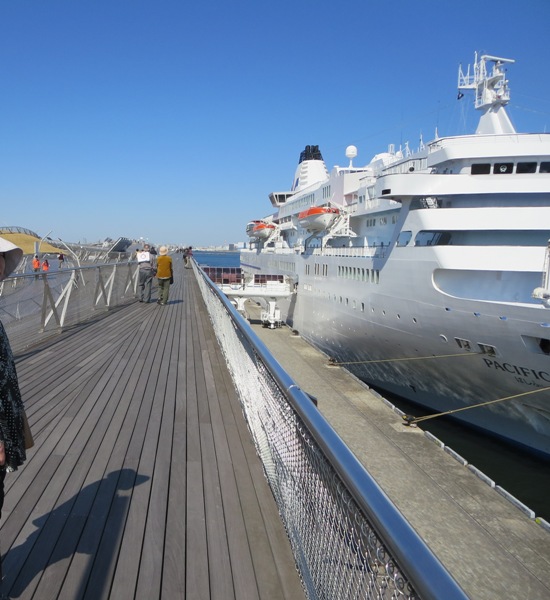 この大桟橋の屋上は「くじらの背中」と言うそうですが、そこからの眺めは絶景です。よくここへ来るという方に声を掛けられて教えて頂いたところ、かすかに東京タワーやスカイツリー、そして富士山も見えました。