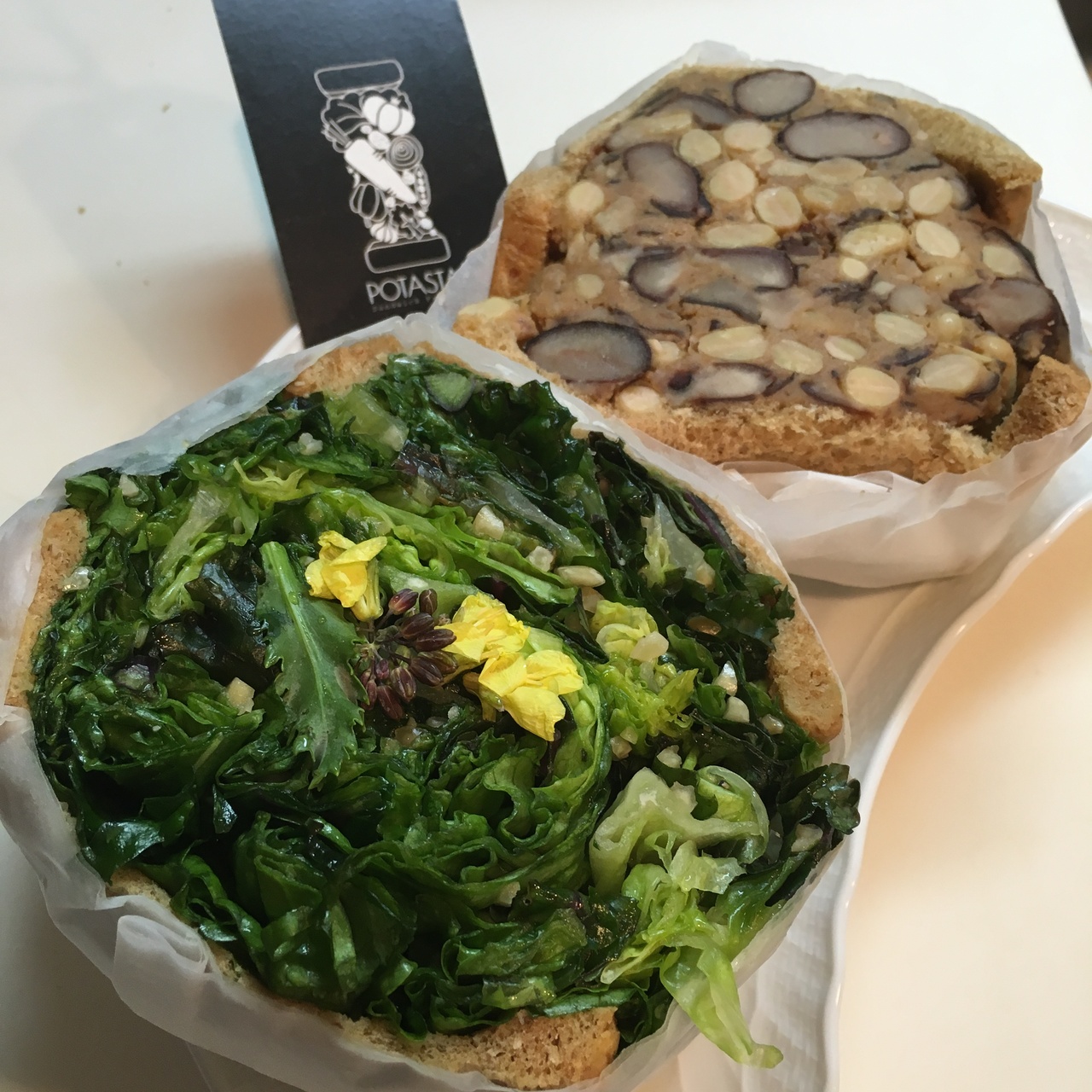サンドイッチは具沢山で断面が見えるようにカットされています。有機野菜たっぷりのサンドや豆ときなこの甘いサンドが人気。営業日や時間はFacebookを参照。週替わりのメニューもあるようです。