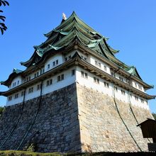 堀からせり上がる見事な石垣は美しく見応えがあり、上部で外側に反る「武者返し」は鉄壁の守り。