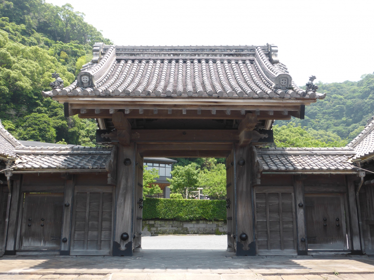 江戸時代は錫門が正門でしたが、敷地を拡げた事で明治になって新たに作られた正門です。島津家の家紋の丸十紋と桐紋が彫られています。国道10号線沿いに立っており。園内から見ると、裏側から見る事になるので、正門を潜って表から見るのがお勧めです。「篤姫」のロケでも使われたようで、ファンには見逃せない所です。