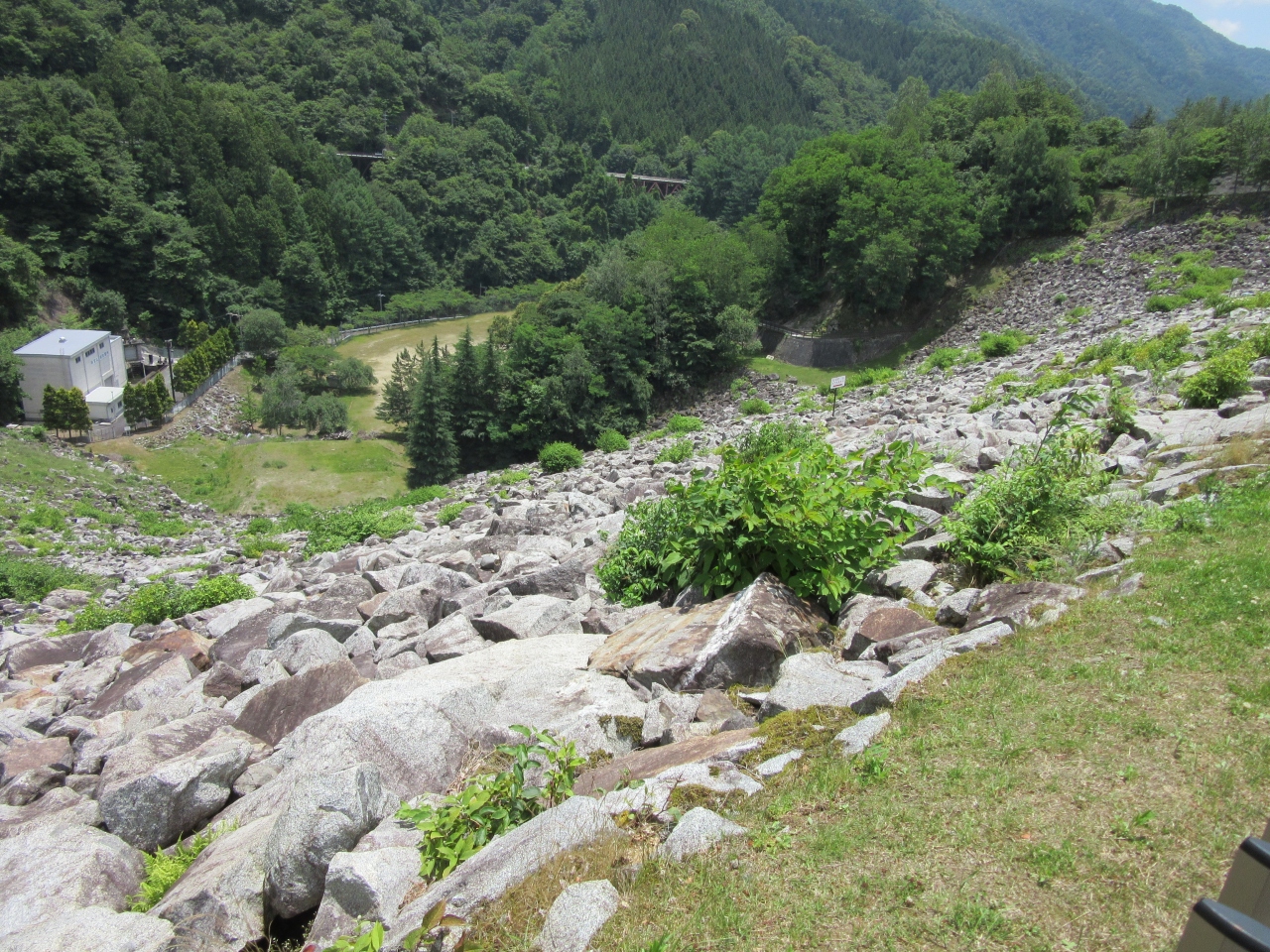 ロックフィルダムは石を積み上げて作っているので他のダムより堤防の傾斜が緩やかなのと、コンクリートが殆ど見えないので、比較的自然に溶け込みやすいです。