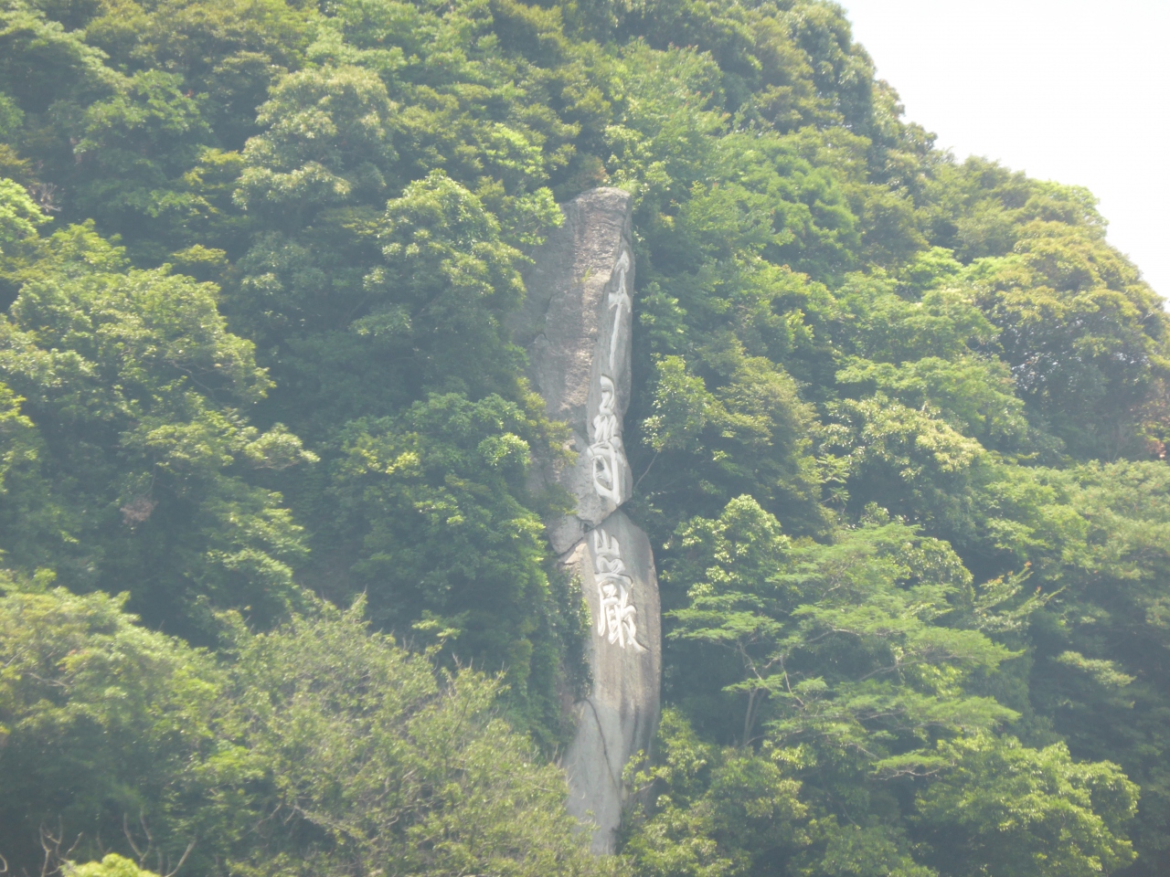 御殿の裏山の巨岩に「千尋巌」(せんじんがん)と刻まれています。3文字の大きさは、上下で11メートル。1814年に、27代斉興がのべ3,900人の人夫をつかい、3カ月かけて作らせたそうです。