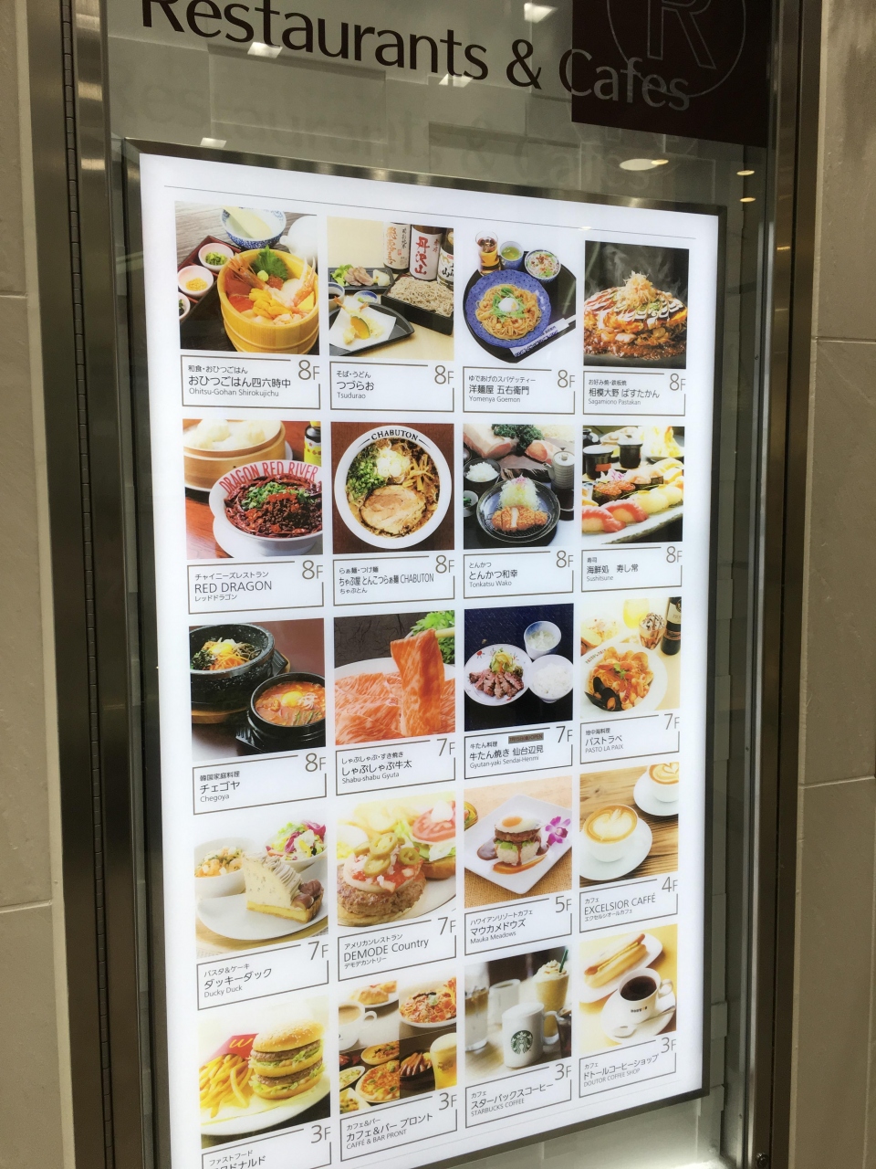 7・8階のレストラン街には有名飲食店が立ち並び、乗降客を向かい入れます。