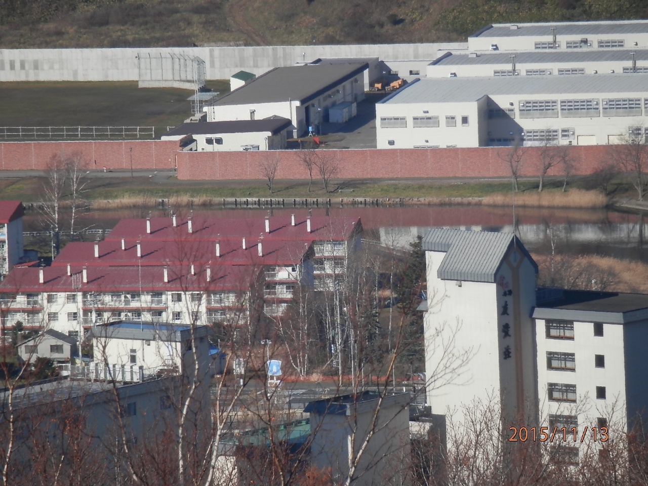 車窓から網走無番地を通り過ぎる。赤煉瓦の塀は地中に1.7mもある。手前の赤い屋根の群れは市営団地。ガイドが説明してくれる。