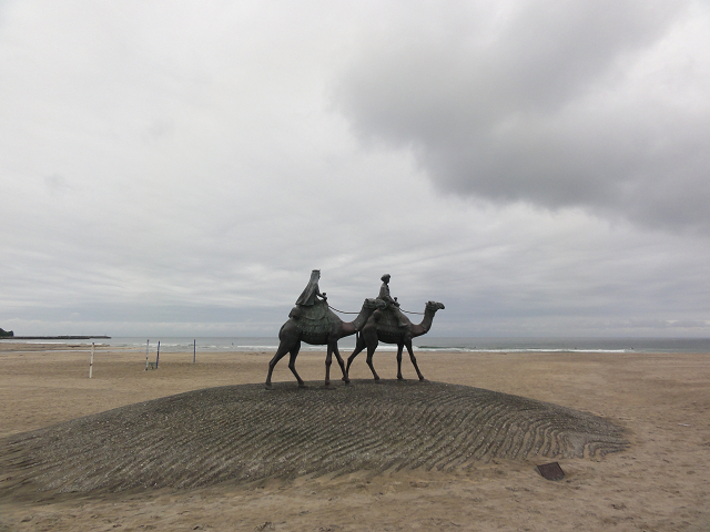 御宿海岸のシンボルと言える像です。近くに月の砂漠公園、月の砂漠記念館もありますが像を見るための駐車場はかなり手前にあり歩きます。記念館の駐車場を目指しましたがお休みで、開放してる様子もなかったので5分ほど路駐しました。海水浴の本格シーズンには出来ないことですね。友人とは、実際にらくだに乗った時の怖さが話題になりました。