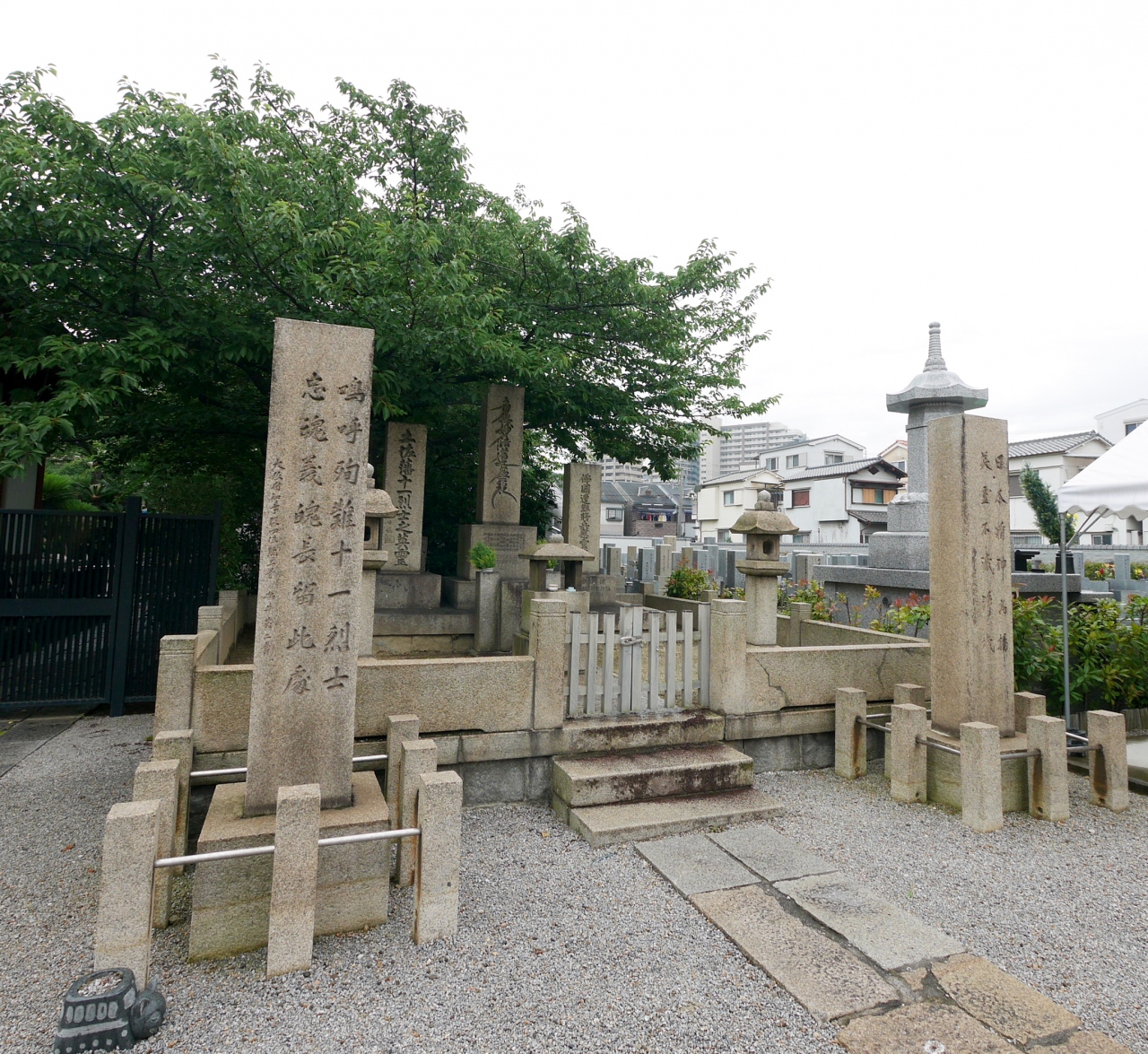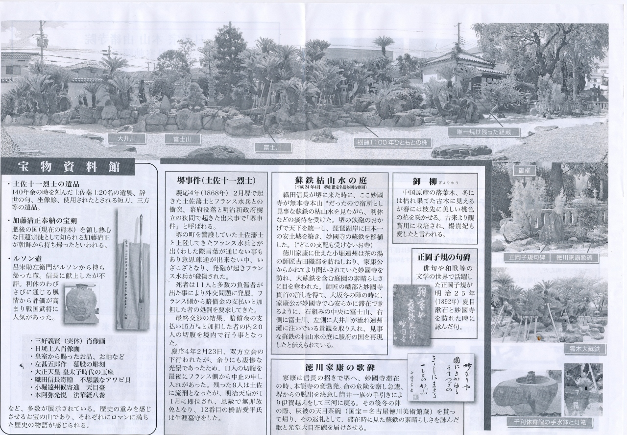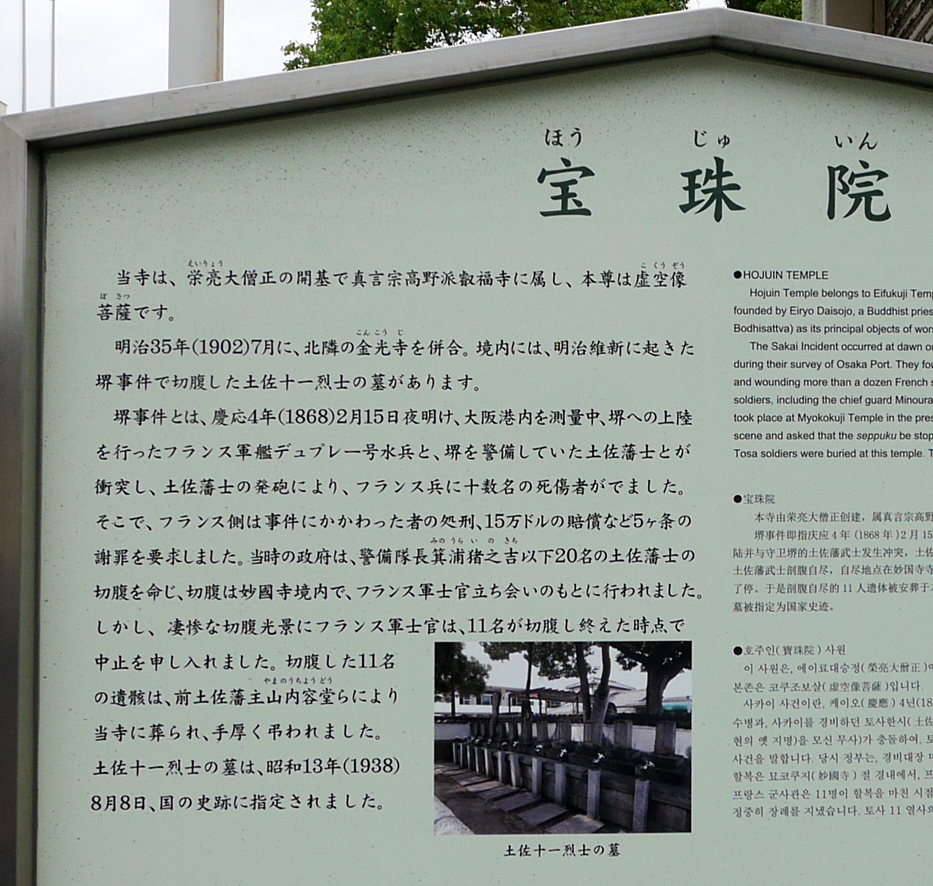 蘇鉄が大きく南国と日本の枯山水を合体したような面白い雰囲気 家康を喜ばせるために,富士川,大井川,富士山の景観を取り入れるなどごますりもある.寺の中に神社がある.有名な土佐藩の堺事件の切腹した藩士を祀る神社なのだろうか.土佐藩士供養塔 幕末の悲劇だ くじ引きで切腹者を決めるなんて理不尽だね 堂々とした本当に立派な切腹だったようだ.近くに案内の柱が建つ.近くの宝珠院に葬られているが,その墓は残念ながら非公開だった.堺旧市内なら行くべきところ