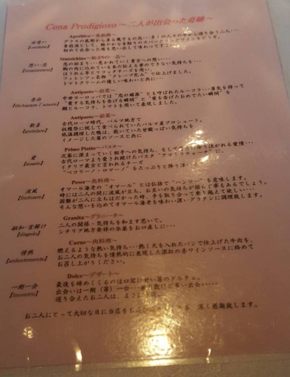 ディナーコースをいただきましたが、全てがチープな印象でした。夜景や親切な接客など、コスパは悪くないと思いましたが、特別に印象に残るお料理がなかったことが残念でした。合コンのようなイタリアン居酒屋のような顧客層でした。