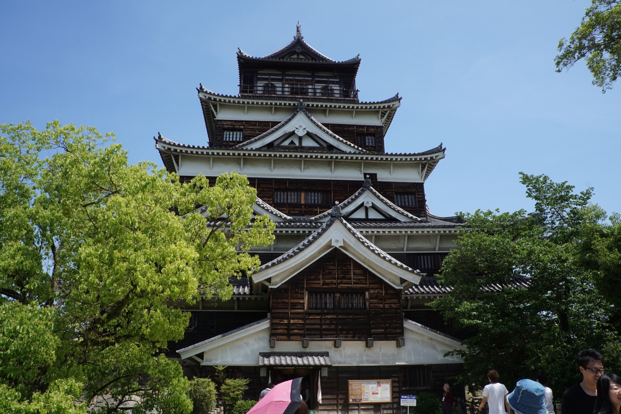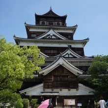 広島城は、原爆で倒壊しているのでこの天守閣も戦後の復元。昭和33年に完成し、初代の天守閣を模したものだそうです。しかし、既にそれなりの年数がたっているので、五層構造の姿はかなり落ち着いた美しさ。石垣のすぐ下は水を満々とたたえた内堀という、そのロケーションの素晴らしさとともに素直に楽しめます。
