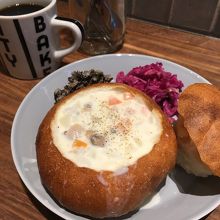 丸いパンをくり抜いてクラムチャウダーが注がれてボリューム満点。デリ2種がちょっと付いています。