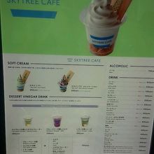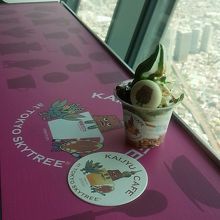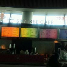 スカイツリーの展望台にあるカフェというよりフードコートぽく一角を囲われたお店です。ゆっくりするなら下の階の340の方がいいと思います。スカイカフェが期間限定でウルトラマンの怪獣カフェとなっていて、通常メニューもありましたが、面白そうなのでピグモンソフト(590円)を食べましたが美味しかったです。