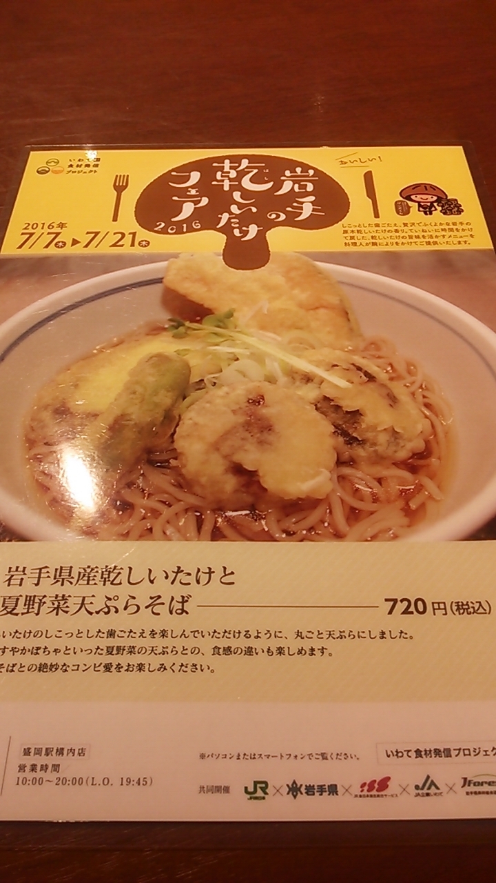2016年7月16日の土曜日に利用したところ、2016年7月7日~2016年7月21日の期間中、岩手県による「岩手の乾燥ししいたけフェア」という食にまつわるイベントの開催を受け、「岩手県産乾ししいたけと夏野菜天ぷらそば」が1杯720円で販売していました。