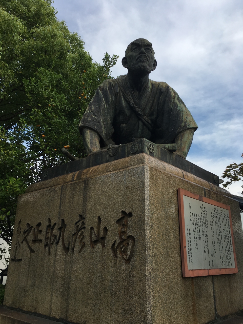 地元では「土下座」とか「土下座像」とも呼ばれています。京阪の駅からすぐの場所で、かつ三条大橋から近いので、待ち合わせのメッカにもなっています。この像は全国の有志によって1928年に建てられ、現在は二代目。台座の書は海軍の東郷平八郎が書いたそうです。
