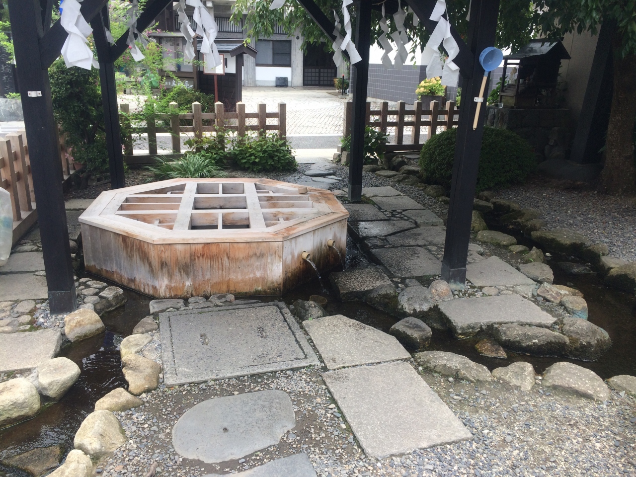 こんこんと水が湧き出る八角形の井戸です。毎日近所の方々の手入れで、いつもきれいに保たれています。ペットボトルで水を汲みに来る方も大勢いて、いつも賑やかです。水は近くの流量の多い用水路に流れていきますが、すべて周辺の湧水のせいか、擁壁の所々にわさびの芽が。住民の方が植えたみたいです。