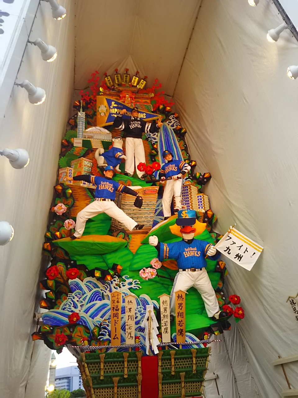 飾り山笠の表題は「熱男翔若鷹」で、今年のホークスも投打そろって日本一をめざしています。