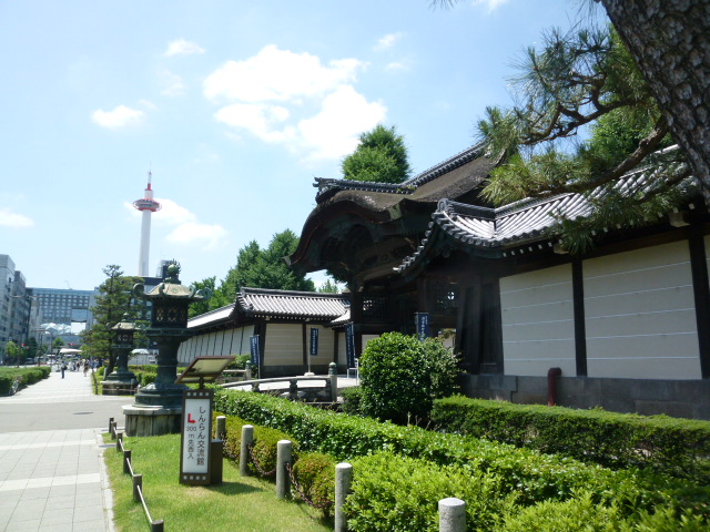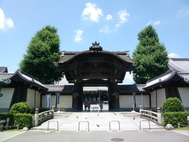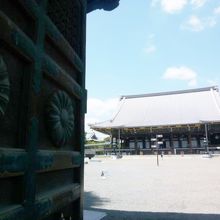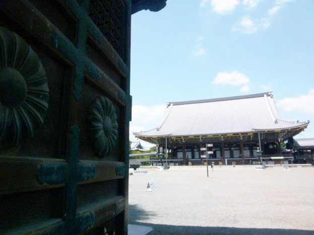 今日は、京都東本願寺を散策参拝します。東本願寺の境内に入るのは数ヶ所の入口がありますが、京都駅から歩いてくる人は、ここ「阿弥陀堂門」から入る人が多いのではないでしょうか。門をくぐり境内に入ると大きな敷地なっていて阿弥陀堂が正面に見えます。阿弥陀堂門と呼ばれるのが良くわかります。右には御影堂が見えますが、その前には御影堂門があります。この阿弥陀堂門は御影堂門より小さいですが合わせて比較したらいいと思います。気付いたことですが阿弥陀堂門には菊の御紋?が彫られています。歴史を感じます。