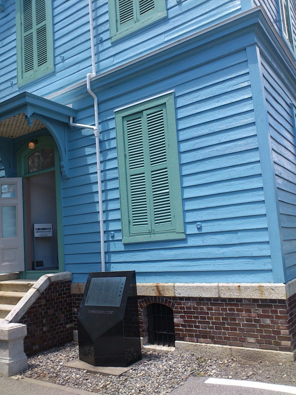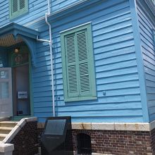 松本城の北へ10分ほど歩くと、旧開智学校があります。旧開智学校の入場口の道を挟んで反対側にこの旧司祭館がありました。右が旧開智学校、左が旧司祭館です。旧開智学校は入場料が必要ですが、こちらは無料で中を見ることが出来ます。ブルーの色がとても目を引くおしゃれな洋館です。旧開智学校へ行くなら、この旧司祭館もどうぞ。