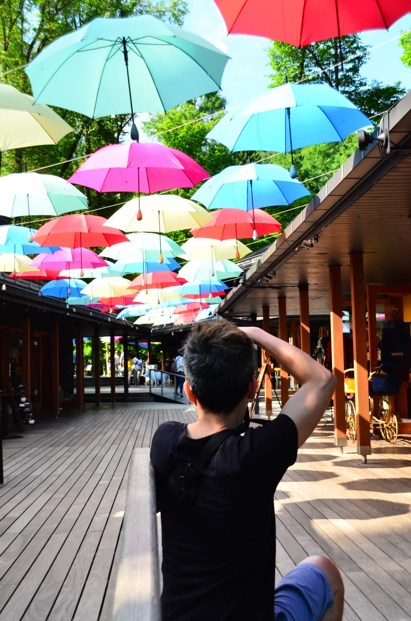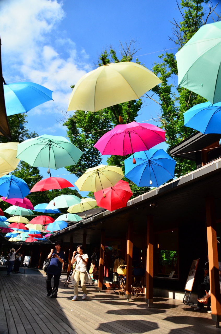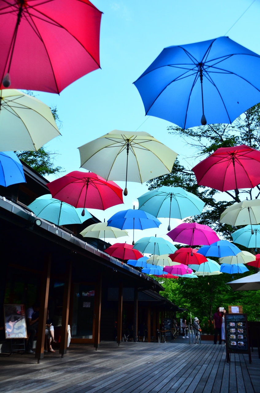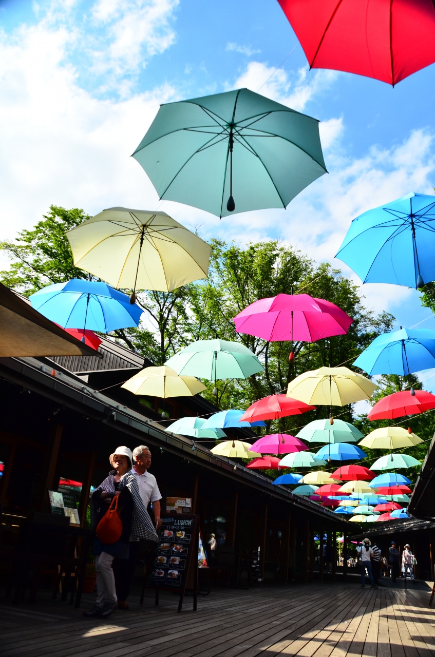 色鮮やかな傘のアーケード「アンブレラスカイ」がハルニレテラスの空を彩ります。