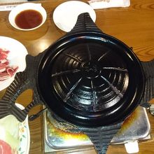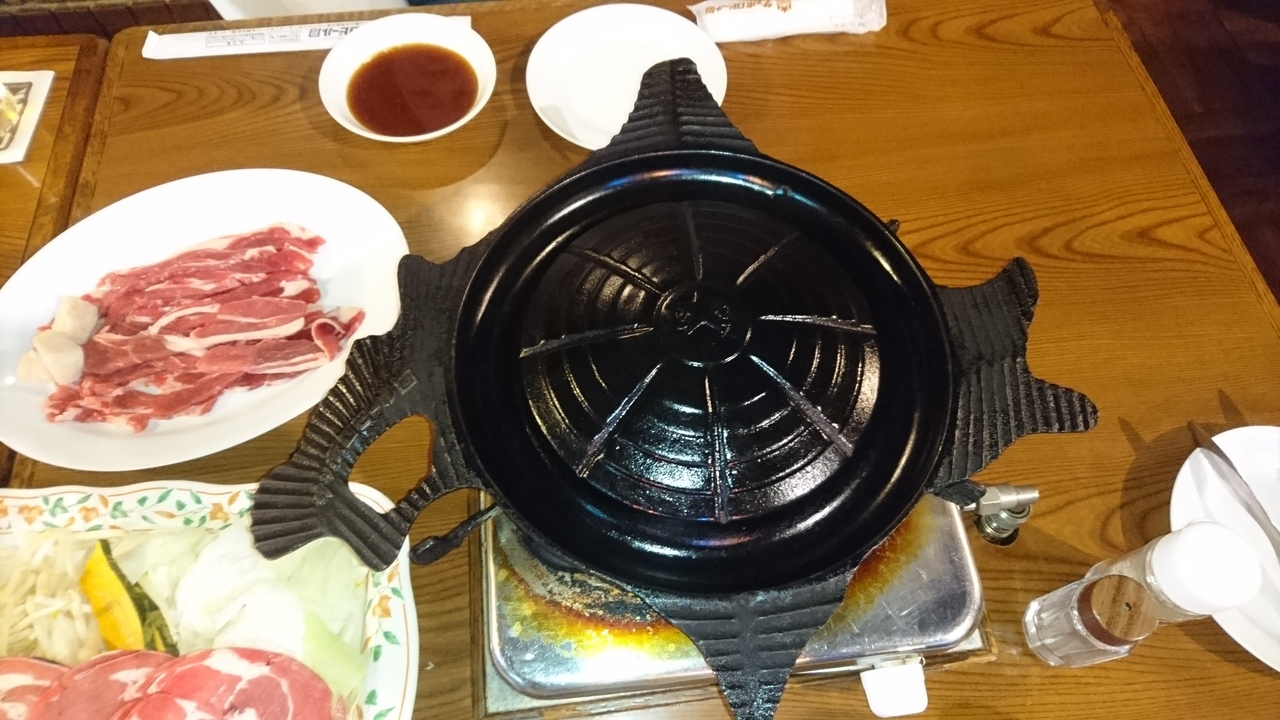 ジンギスカンは北海道の形をしたジンギスカン鍋で食べるスタイル。