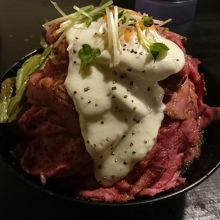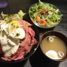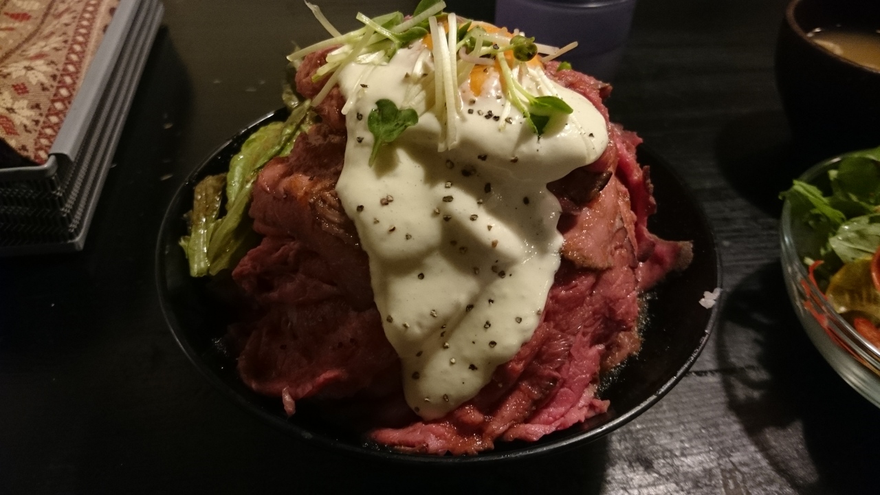 多数のマスコミに報道され、東京・高田馬場のお店は、数時間待ちの行列ができますが、こちらは21時という時間もあるとは思いますが、待ち時間は10分くらいでした。お店は、三宮駅のダイエー近く、JRの高架下にある神姫バスの三宮バスターミナルの目の前で、1階は居酒屋で細い階段を登っていきます。ステーキ丼かローストビーフ丼か迷いましたが、初レッドロックの私は、のーまるに、ローストビーフ丼の大盛り(1019円)を注文。特製の煮込みダレがお肉とフィット。ヨーグルトソースがマイルドさを与えています。ただ、肉が大盛りのように見えますが、これはご飯の盛り方にごまかされていると言ってもいあかも。盛り方上手なのかも。せっかくなので、みそ汁+サラダセット(290円)にしました。サラダは下に溜まっている玉ねぎに味が付いていましたが、さっぱり味でした。コスパを考えるとかなりお得なお店、東京のお店が長蛇の列なのもわかります。