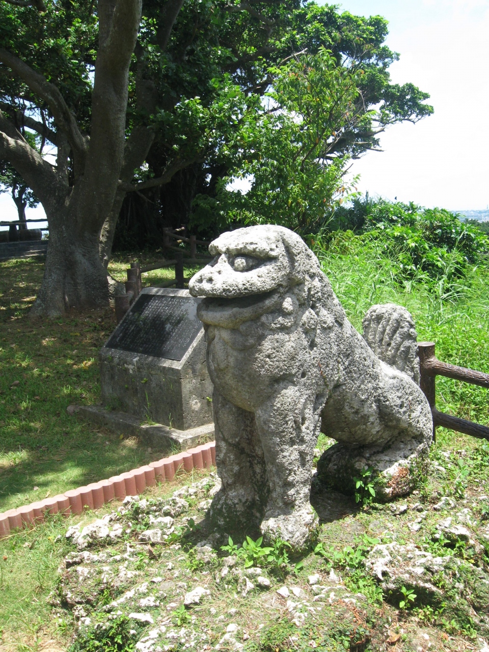 今では駐車場が作られ、一部木が生い茂っていて見通しのきかないところが場所がありますが、ほとんどは視界が広がっています。戦時中の写真では石獅子がポツンと置かれているだけのため、それを弾除けにするしかなかったようにも思えます。弾痕の残っているものは沖縄県の各地に残ってはいますが、観光地とされる場所ではあまりないようにも思えます。勢理城跡という謂れすらわからない丘の上に立つ石獅子と、その敷地内から見られる景色は相反するような意味合いも感じられますが、やはりここも戦場となった史実を忘れないようにすることにより、沖縄全土が戦場になったことを肌で感じることになるのではと改めて思います。