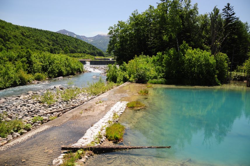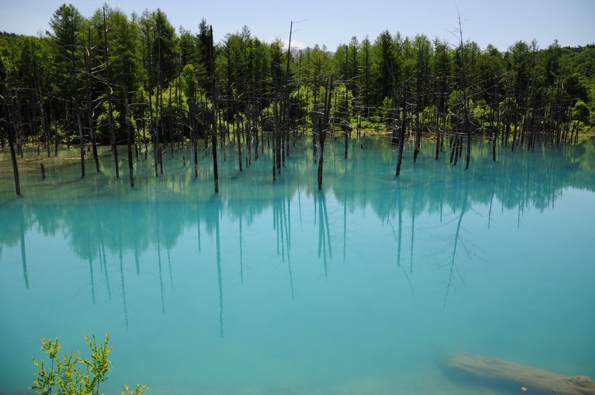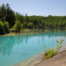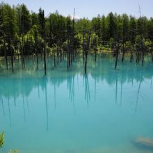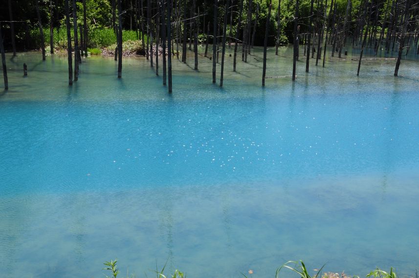 ファーム富田の後、青い池を目指した。30分ほどだが、道道353号から道道966号にビルケの森で右折して入るのだが、ナビはその内側をショートカットする無舗装道を案内した。無舗装に入る前に気付いて、遠回りする形で舗装道を行ったが、北海道ではレンタカーで変なナビに当たると痛い目に合うので注意が必要だ。観光地を知らないナビも多いので、スマホ等のナビも合わせて活用すべきだろう。道道966号から青い池方面に左折して無舗装道を少し走ると、広い無料駐車場がある。平日10時過ぎに到着したが、結構混み合っていた。空きがないと言うほどでもない。遊歩道を歩いていくと右側に青い池が見えてくる。池の中から木立が立つ不思議な光景だ。マグネシウムを含んでいるために、水がコバルトブルーに見えるらしい。ときおり風が水面を撫でて、日の光で細かな銀波を立てるのが美しい。一番奥まで行くと、池の向こうに青い水が流れる美瑛川がある。池と川の間に堤があり、川が増水した時だけ池に水が流れ込むらしい。実はこの池は地図には正規の地図には載っていない。池ではなく、水たまりの扱いだそうだ。