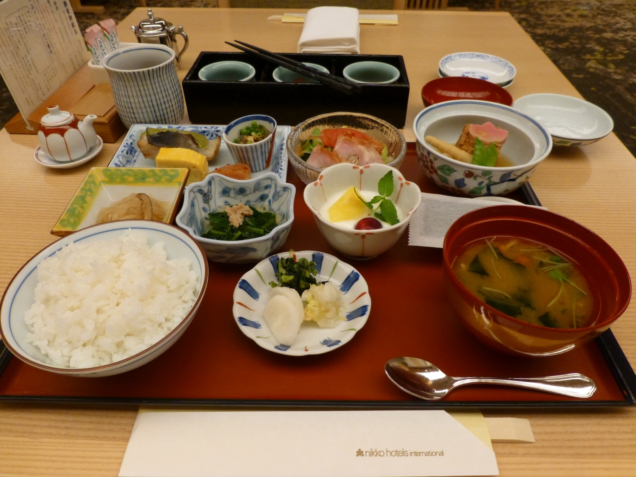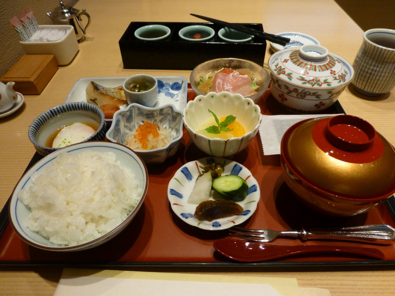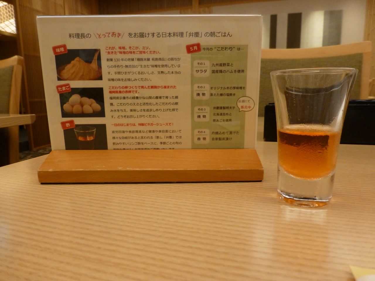 ホテル日航福岡に宿泊した際に朝食で利用しました.食前にりんご酢のジュースを出してくれます.今回はイチゴフレーバーでした.料理は定食ですが,品数も多く,楽しめました.確か,連泊の場合は魚を変えてくれるはずです(すみません,忘れてしまいました).
