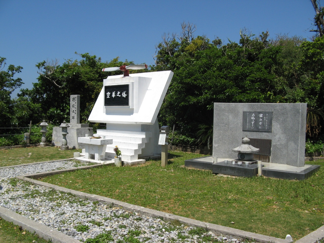 先の大戦において、沖縄戦ならびに南方諸地域航空戦での戦没者、兵士と運命を共にした航空機材をお祀つりされています。慰霊塔の上部にプロペラが取り付けられていて、はじめは、戦闘機などの乗員をお祀りされていると思いましたが、碑文を見て主として徴用された民間航空関係者をお祀りしていることを知りました。兵士だけでなく、定期航空や航空輸送などに従事して戦場に散った民間人も多数おられることを記憶にとどめたいと思いました。