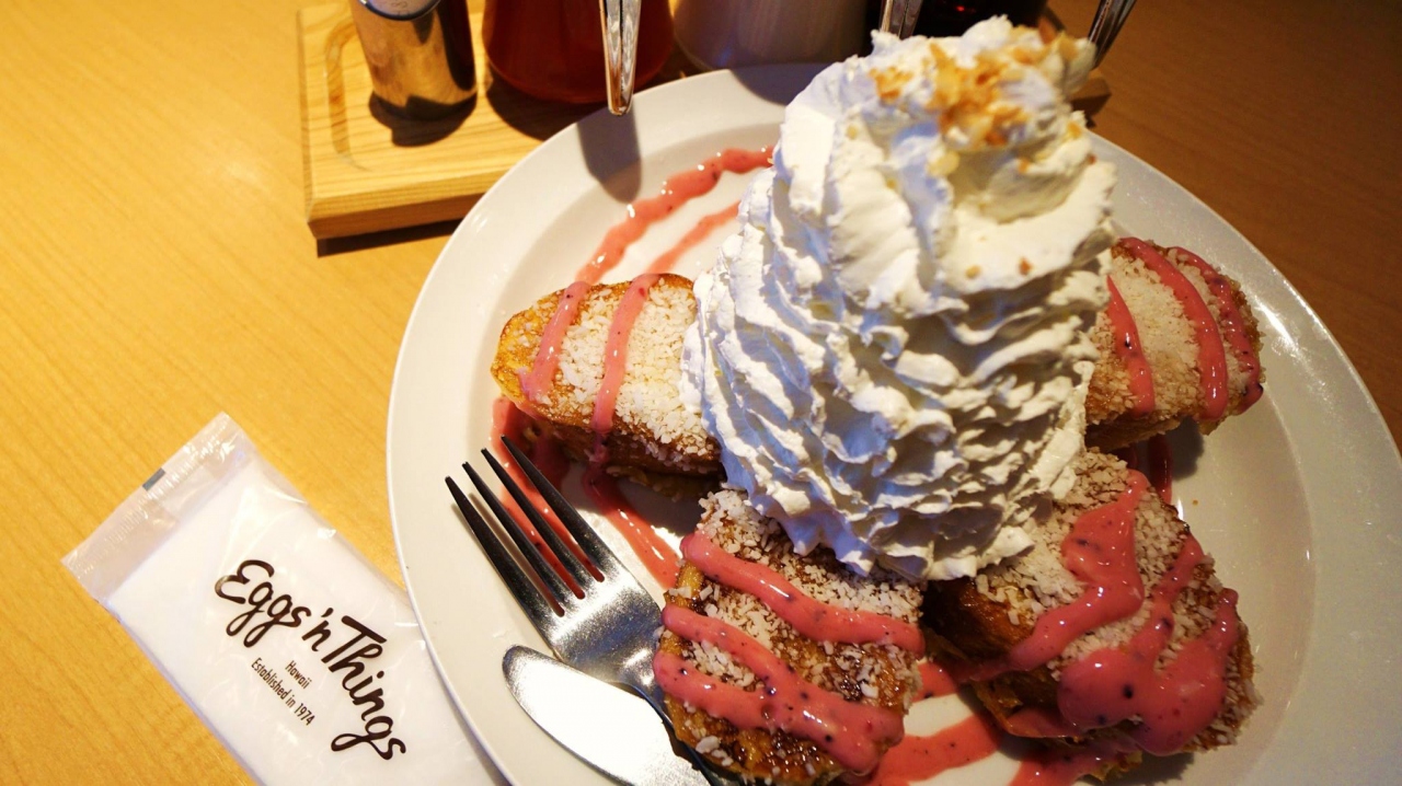 人気商品はやはり生クリームがうず高く盛られたハワイアンパンケーキ。