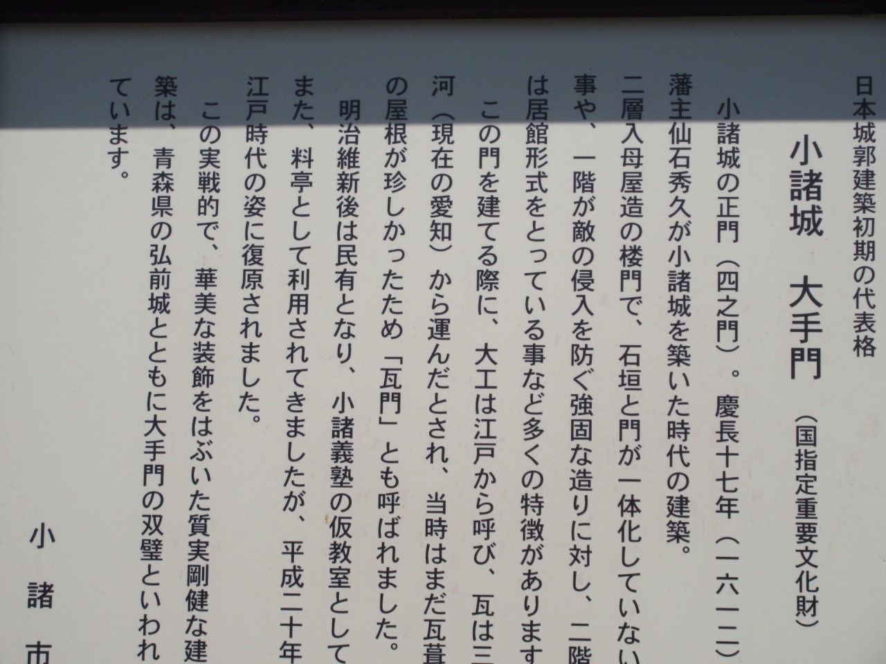 三の門が懐古園の入口すぐ前にあるのに対し、大手門は線路しての地下通路を越えたところにあります。こちらが小諸城の表玄関、正門です。