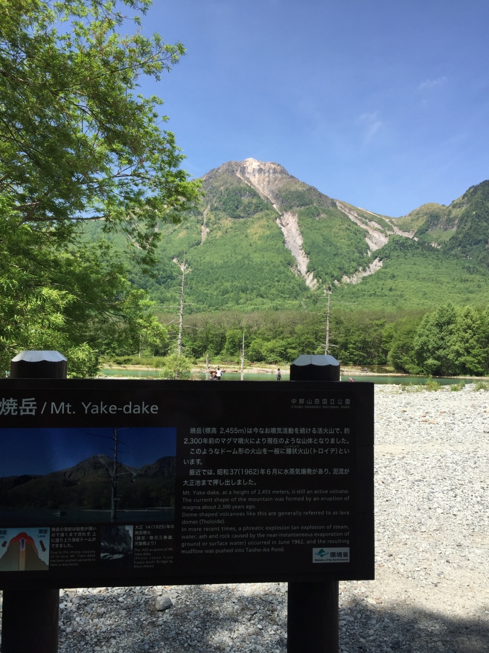 上高地に入り最初に見えるのが焼岳です。2400mの活火山でいまもガスの発生があるようです。北嶺と南峰があり北嶺の方は登山可能ということでした。大正池からの焼岳はとても綺麗に見え梓川とのマッチが美しいです。