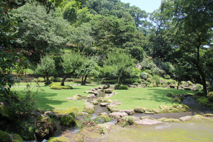 仙巌園内を流れる保津川の東側に江戸時代からそのままの姿で残っている庭園があります。小川の上流から流した酒盃が通り過ぎる前に詩歌をつくって酒を飲む「曲水の宴」が行われた庭園です。毎年3月上旬には「流しびな」が開催される様です。