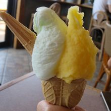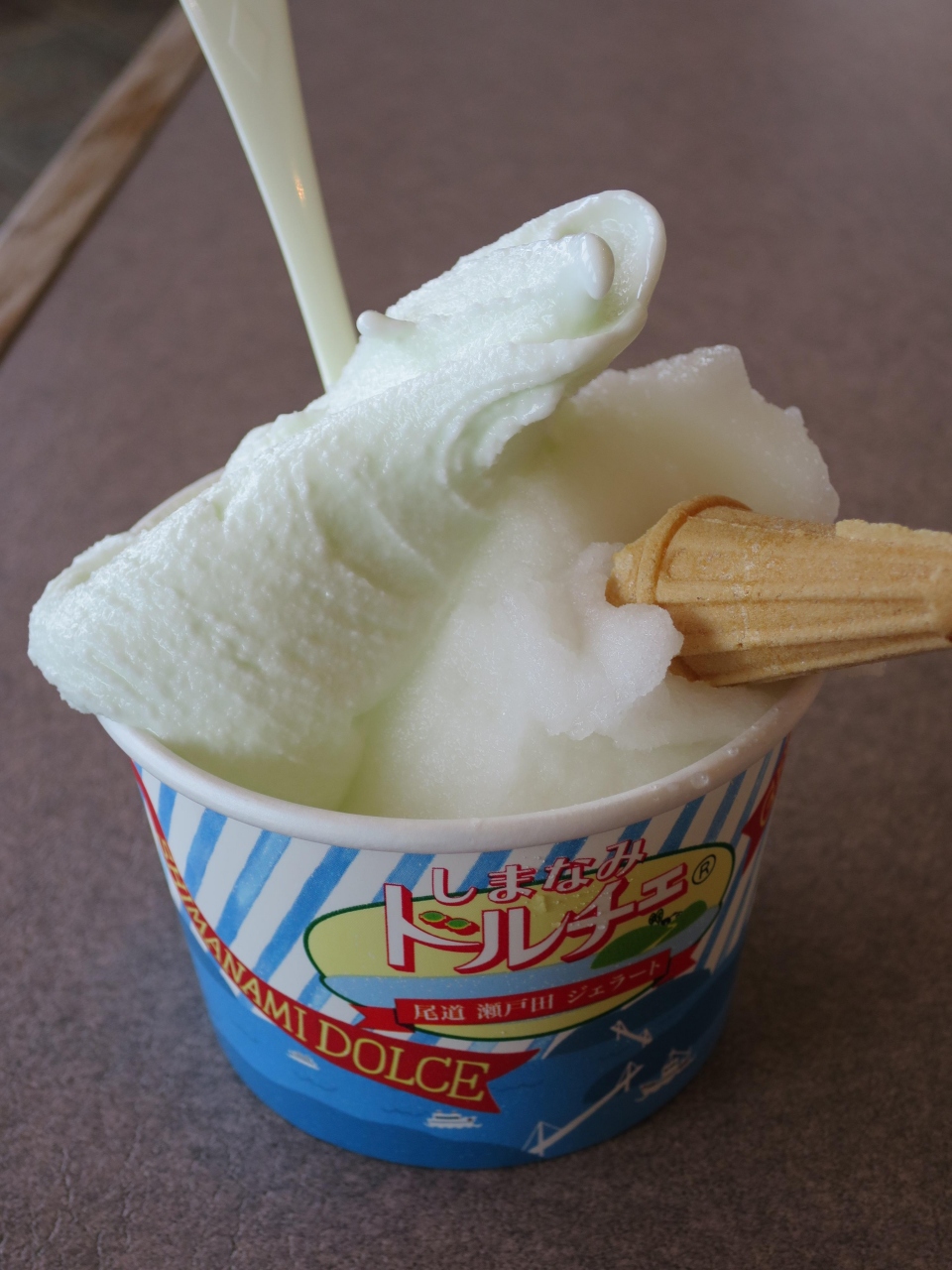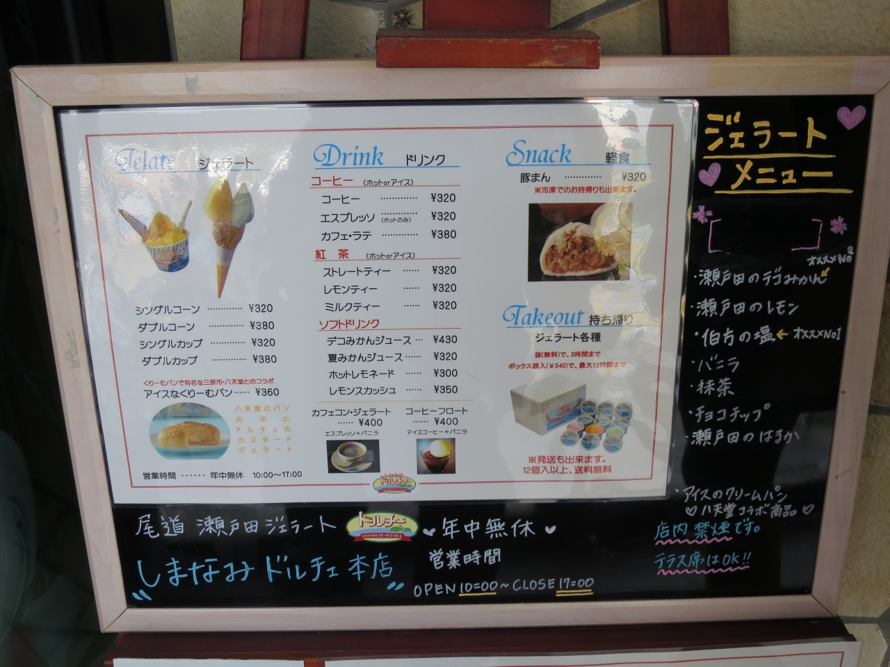 ショーケースの前から店の入口外まで」行列ができ、並んで買います。とは言っても10分も掛かりません。ジェラードの味は生口島名産のレモンやでこみかん等の柑橘系がありますが、何と言っても伯方の塩がお奨め。甘さと塩味が絶妙です。