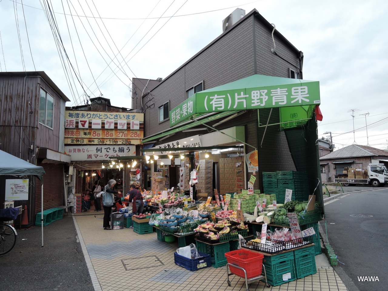 横浜市磯子区にある浜マーケットは、路地レベルの緩い坂道の両脇に食品系を中心とした店舗が連なるアーケード付きの小売市場です。