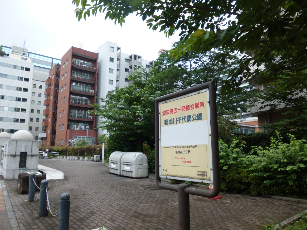 「千代橋」は、かつて築地川だった場所に架かる橋のひとつです。現在は首都高速道路が通っています。なかなか見ごたえのある親柱と欄干ですが、すぐ脇に災害時の集合場所としての公園が設置されていることもあり、逆に目立たなくなっている印象があります。都会の一光景として溶け込んでしまっている感じです。